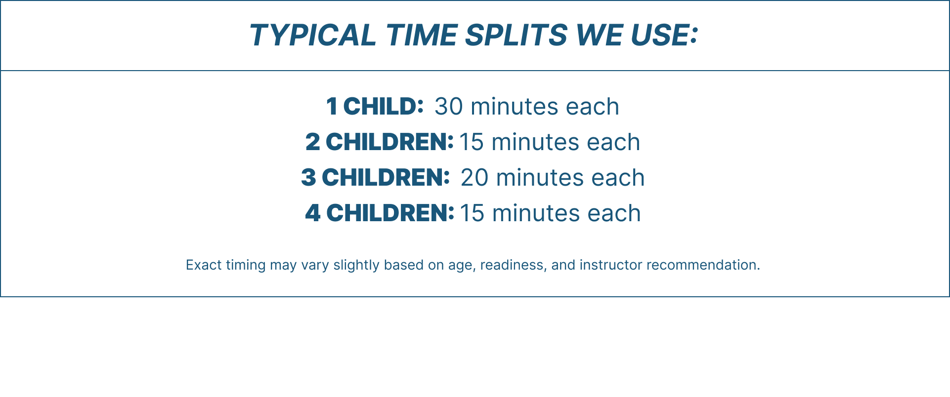 FLEXIBLE TIME, INTENTIONAL STRUCTURE: Lesson time is divided into back-to-back segments so each swimmer gets dedicated focus. Instructors help guide the structure based on age, attention span, and readiness — ensuring each child gets meaningful time in the water.