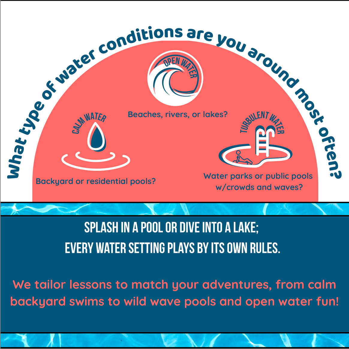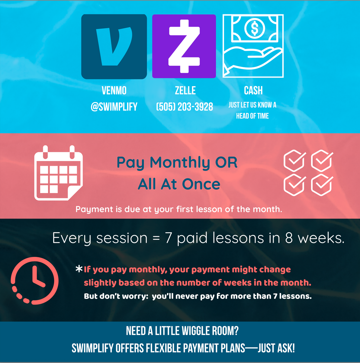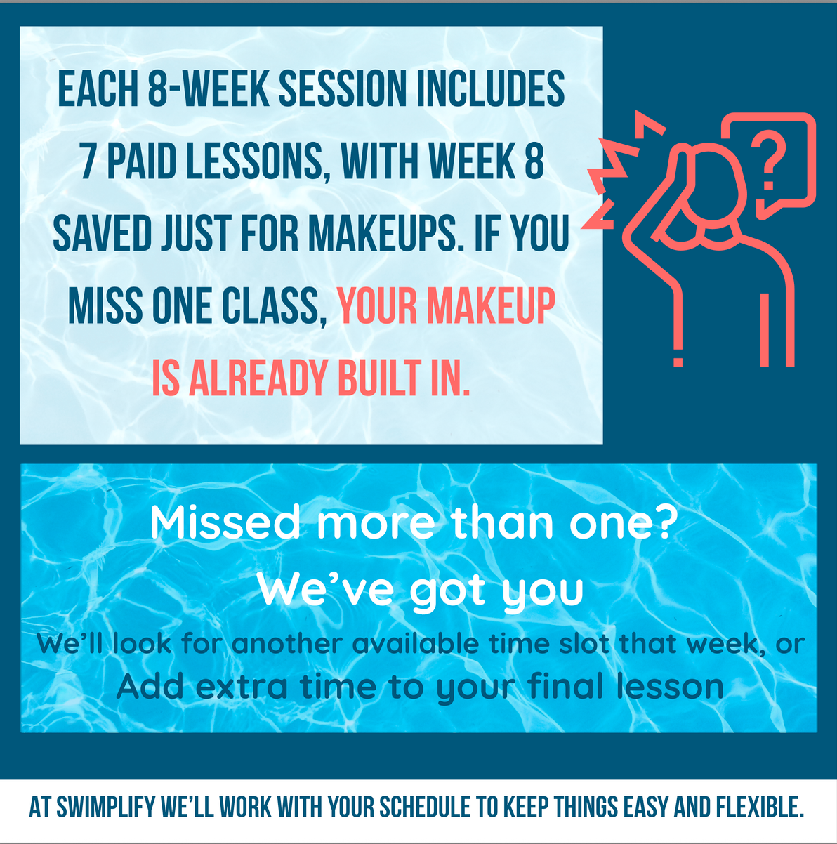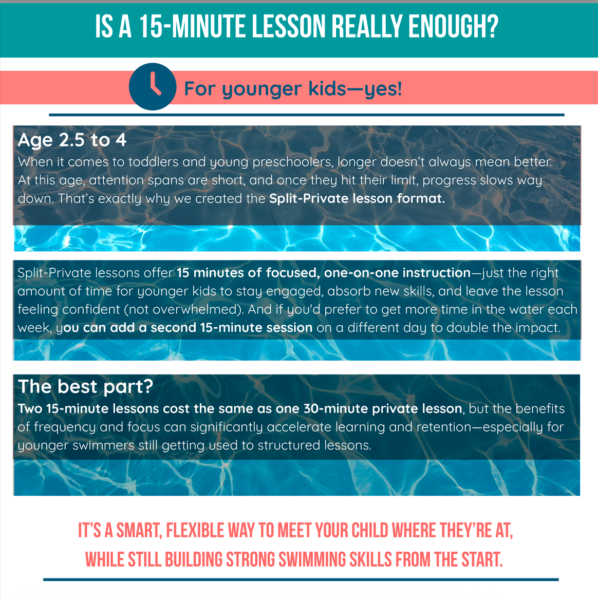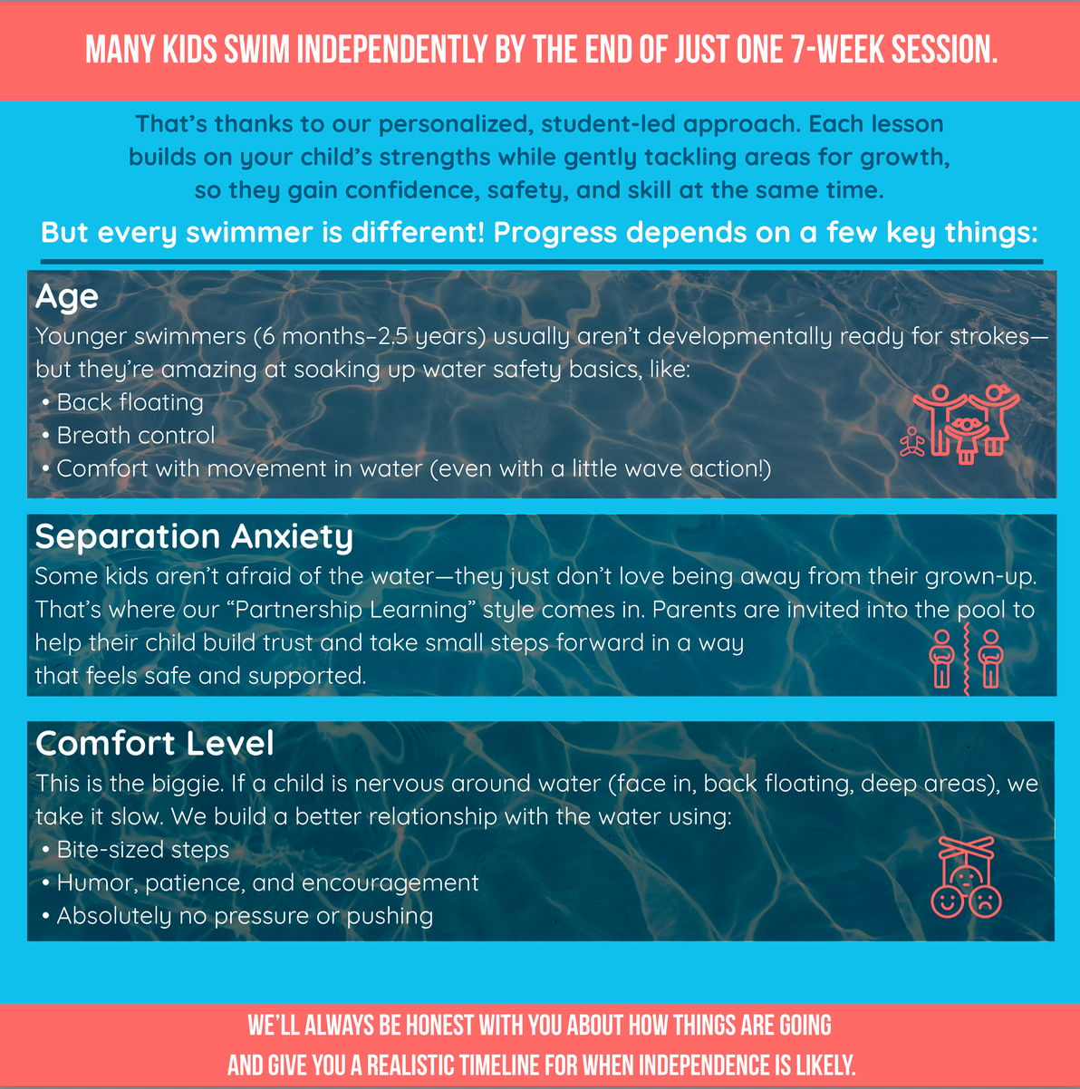 Our most frequently asked questions How long will it take for my child to swim independently? What if we miss one of our lessons? What payment methods do you accept? Questions for Parents