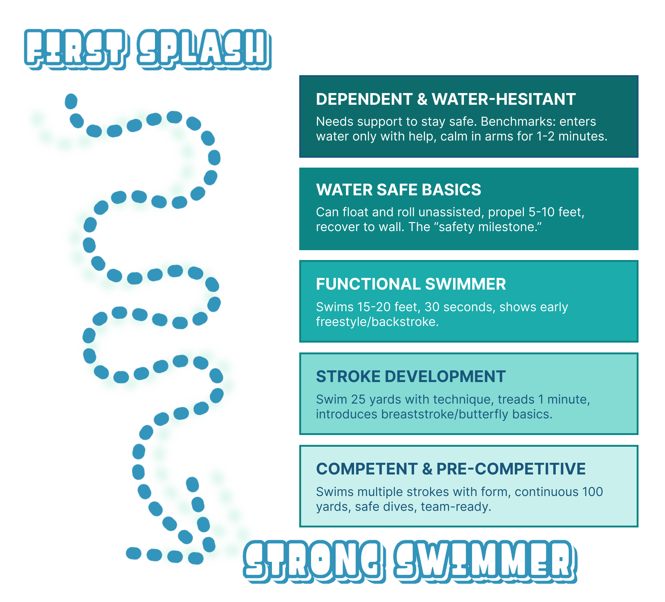 Example: A Stage 1 swimmer works toward floating, rolling, and propelling 10 feet. Once those are solid, they unlock Stage 2 safety.